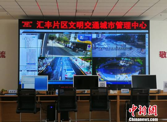 25日,在匯豐片區文明交通城市管理中心,大屏幕上顯示著該區域內的交通情況。匯豐片區文明交通城市管理中心辦公室主任趙進芬告訴記者,每條街道都有“6員”定崗定責,一經發現交通問題,第一時間進行處理。6員即派出所民警、交警、城管、環衛、小巷管家、街巷長。