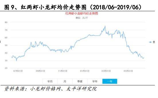 最近這些年來(lái),小龍蝦價(jià)格也因?yàn)槭袌?chǎng)供需變化而有所波動(dòng)。據(jù)太平洋證券發(fā)布的研究報(bào)告,2017年,小龍蝦價(jià)格走高,這主要受供給端影響,天災(zāi)人禍等導(dǎo)致的小龍蝦產(chǎn)量減少。到了2018 年,小龍蝦價(jià)格高漲主要受需求端影響,世界杯、新社交打造爆品、餐飲巨頭、電商巨頭入局等導(dǎo)致小龍蝦價(jià)格高漲。2019年上半年,之所以價(jià)格走低,主要是受供需兩方面的影響,供給端養(yǎng)殖戶增加、天氣原因?qū)е滦↓埼r集中上市,需求端經(jīng)濟(jì)下行、世界杯效應(yīng)消失,消費(fèi)回歸理性,導(dǎo)致暫時(shí)的供大于求價(jià)格走低。2019年下半年,隨著稻蝦結(jié)束,各種湖蝦、野蝦產(chǎn)量也會(huì)急劇減少,7月份,小龍蝦價(jià)格可能會(huì)緩慢回升。