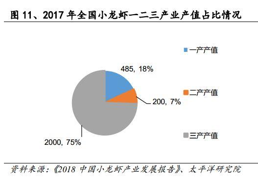 根據(jù)農(nóng)業(yè)農(nóng)村部漁業(yè)漁政管理局聯(lián)合全國(guó)水產(chǎn)技術(shù)推廣總站、中國(guó)水產(chǎn)學(xué)會(huì)組織專家編寫的《中國(guó)小龍蝦產(chǎn)業(yè)發(fā)展報(bào)告(2018)》(下稱《小龍蝦報(bào)告》)測(cè)算,2017年,全國(guó)小龍蝦全社會(huì)經(jīng)濟(jì)總產(chǎn)值約2685億元,比2016年(1466.10億元)增長(zhǎng)83.15%。其中,養(yǎng)殖業(yè)產(chǎn)值約485億元,以加工業(yè)為主的第二產(chǎn)業(yè)產(chǎn)值約200億元,以餐飲為主的第三產(chǎn)業(yè)產(chǎn)值約2000億元。