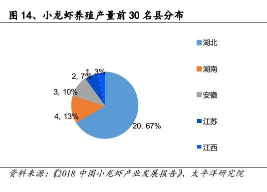 在全國(guó)小龍蝦養(yǎng)殖產(chǎn)量前30名的縣(市、區(qū)),小龍蝦養(yǎng)殖總產(chǎn)量為73.49萬(wàn)噸,占全國(guó)小龍蝦養(yǎng)殖總產(chǎn)量的65.05%。其中,湖北省監(jiān)利縣小龍蝦產(chǎn)量為11萬(wàn)噸,是唯一產(chǎn)量超過(guò)10萬(wàn)噸的縣。湖北荊州市(下轄監(jiān)利縣、洪湖市、石首市、荊州區(qū)、公安縣、江陵縣等均為小龍蝦養(yǎng)殖產(chǎn)量前30)小龍蝦產(chǎn)量占全國(guó)接近30%,是全國(guó)小龍蝦的核心主產(chǎn)區(qū)。因?yàn)檫@里植被好、湖泊多、氣候溫和、土壤肥沃,是小龍蝦的天然養(yǎng)殖場(chǎng)。