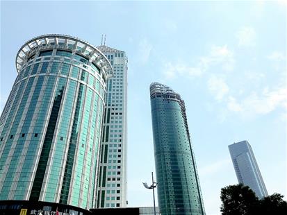 圖為:武漢市建設大道附近,外墻為玻璃幕墻的建筑眾多。