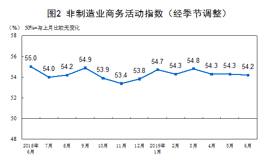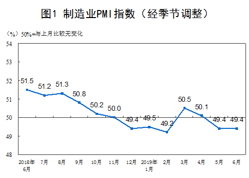 人民網(wǎng)北京6月30日電 (楊曦)國家統(tǒng)計(jì)局今日發(fā)布了6月份中國采購經(jīng)理指數(shù)。數(shù)據(jù)顯示,2019年6月份,中國制造業(yè)采購經(jīng)理指數(shù)(PMI)為49.4%,與上月持平;非制造業(yè)商務(wù)活動(dòng)指數(shù)為54.2%,比上月微落0.1個(gè)百分點(diǎn),繼續(xù)位于擴(kuò)張區(qū)間。