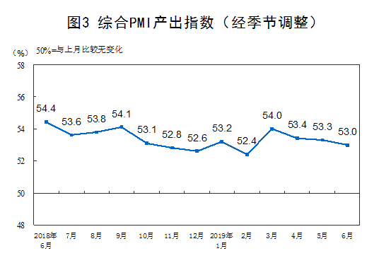 2019年6月份,綜合PMI產(chǎn)出指數(shù)為53.0%,比上月回落0.3個(gè)百分點(diǎn),表明我國企業(yè)生產(chǎn)經(jīng)營活動(dòng)保持?jǐn)U張,但步伐有所放緩。