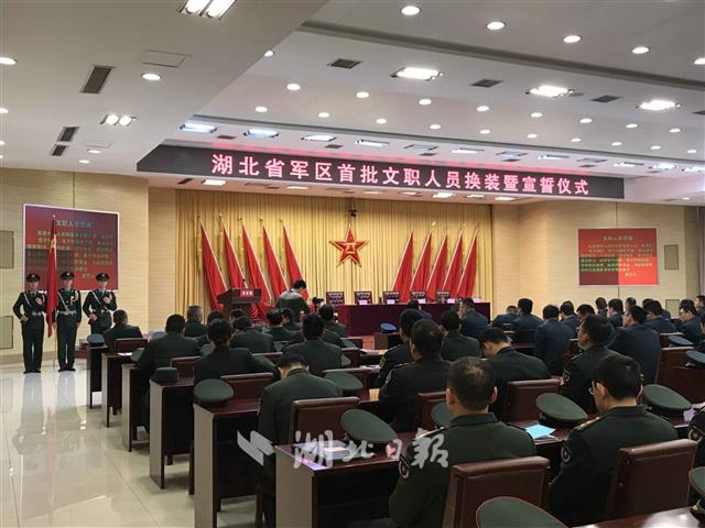 湖北日報訊(記者江卉、通訊員何武濤)1月11日,湖北省軍區舉行首批文職人員換裝暨宣誓儀式。省軍區系統200余名文職人員,集體換上被稱為“孔雀藍”的文職人員制式服裝。從今天起,他們將以另一種身份為部隊作貢獻。參加此次換裝儀式文職人員,包括去年由現役干部轉改的文職人員、已納編的原社會招聘文職人員和2018年面向社會公開招考招錄聘用的文職人員。
