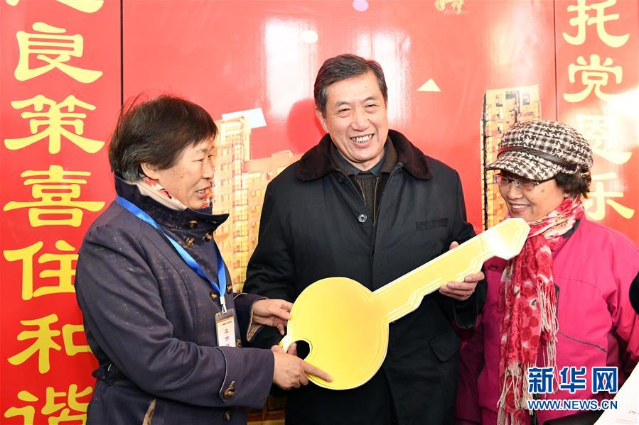 回遷居民遲明德(中)成為濟(jì)南市槐蔭區(qū)經(jīng)十一路棚戶區(qū)改造項(xiàng)目——和諧佳苑小區(qū)第一位辦理回遷入住的居民(2018年12月20日攝)。新華社記者 郭緒雷 攝