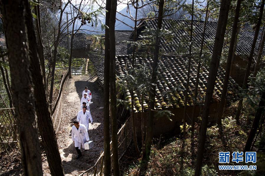 陜西省漢中市寧強(qiáng)縣中醫(yī)醫(yī)院主治醫(yī)師董飛和他的家庭簽約醫(yī)生團(tuán)隊(duì)在石壩子村走訪(2018年11月21日攝)。 新華社記者 陶明 攝