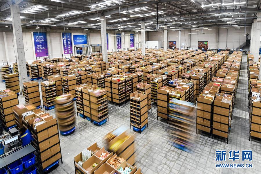 智能搬運(yùn)機(jī)器人在位于江蘇無(wú)錫的菜鳥(niǎo)未來(lái)園區(qū)的倉(cāng)庫(kù)內(nèi)進(jìn)行搬運(yùn)作業(yè)(2018年11月8日攝)。 新華社記者 李博 攝