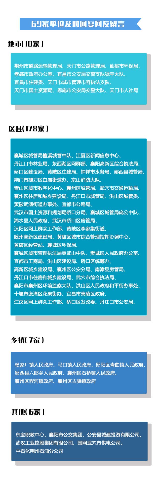 2月19日至28日,《荊楚問政》共收到53條有效留言,39條留言轉辦至相關部門。截止目前,已有武漢市漢陽區城市數字化信息網絡中心、荊州市政務服務和大數據管理局、松滋市人民政府、襄陽市襄州區政務電子政務信息管理中心、宜昌市伍家崗區人民政府辦公室和南漳縣互聯網信息管理辦公室等6個部門認領了《荊楚問政》平臺賬號。