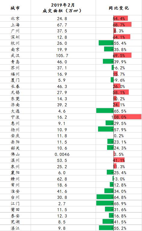 表:2019年2月代表城市商品住宅成交面積及同比變化