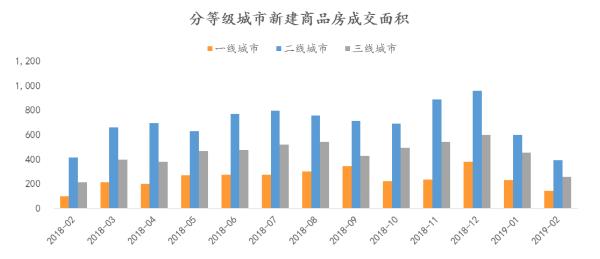 受春節假期影響,2019年2月30個重點城市商品房成交面積環比下跌38.5%,但同比2018年2月上漲8.3%。分城市等級來看,各等級城市銷售面積環比均有不同程度下降。其中,三線城市跌幅最大,成交量環比下跌43.5%。從同比變化看,一線城市成交量同比上漲44.6%,二線城市同比下跌6.1%,三線城市同比上漲19.5%。經過了嚴厲調控的2018年,部分城市的購房需求開始釋放。