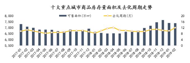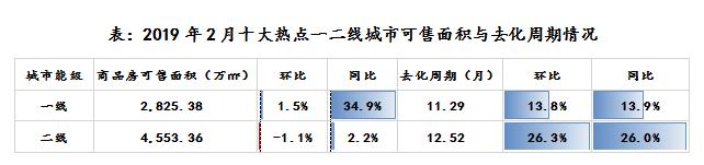 2018年下半年以來,熱點一二線城市供應放量,隨著供應面積增長,去化周期有所延長,十大熱點城市2月平均去化周期12個月,維持在可控水平。分等級城市看,熱點一二線城市隨著供應面積的增長,去化周期有所拉長。其中一線城市去化周期11.29個月,二線城市去化周期12.52各月。