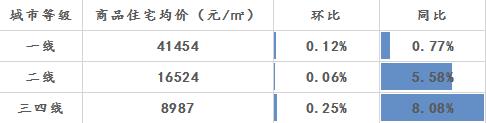 2019年2月,分能級來看:一線城市均價41454元/㎡,環比微漲0.12%,同比上漲0. 77%,價格維持平穩走勢。二線城市均價16524元/㎡,環比微漲0.06%,同比上漲5.58%,此前熱點二線城市房價過快上漲的局面已經得到扭轉。三四線城市均價8987元/㎡,環比微漲0.25%,同比上漲8.08%,從環比變化來看房價已經逐步趨穩。