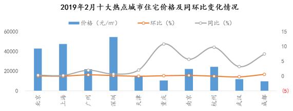 從十大熱點城市房價變化情況來看,2019年2月,各城市住宅價格環比漲跌幅微小,房價保持穩定的發展態勢不變。上海、天津、杭州、武漢四城住宅價格環比下跌,廣州、深圳、重慶、南京、成都五城環比上漲,北京環比持平。從同比變化來看,二線熱點城市如重慶、杭州、成都等城市價格上漲幅度較大,主要受人才新政、2018上半年熱點二線樓市火爆等因素的影響。一線城市價格同比漲幅趨緩,其中廣州住宅價格同比漲幅1.94%,在一線城市中漲幅最高,北上深價格同比漲幅都在1%以下。