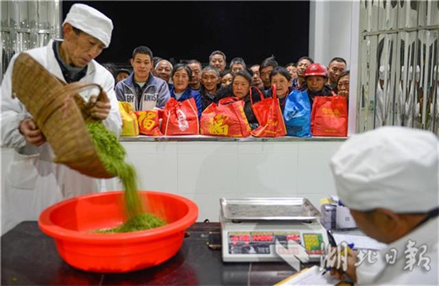 4月1日,在秭歸縣九畹絲綿茶鮮葉收購窗口,合作社社員交售單芽。