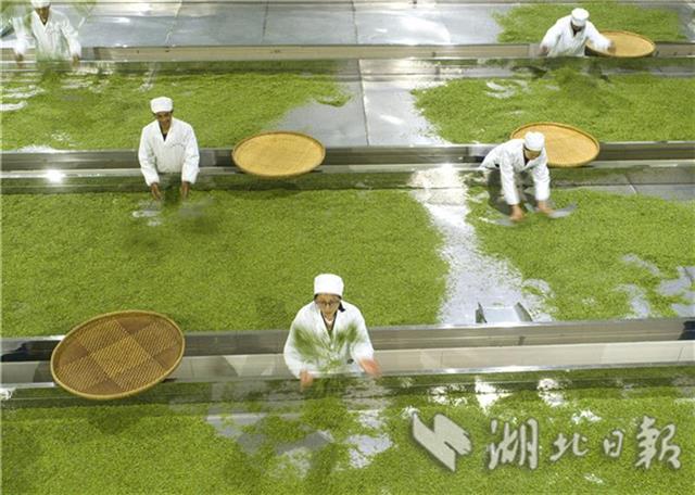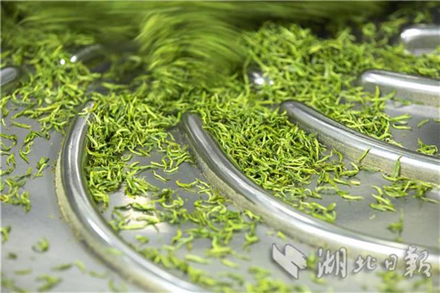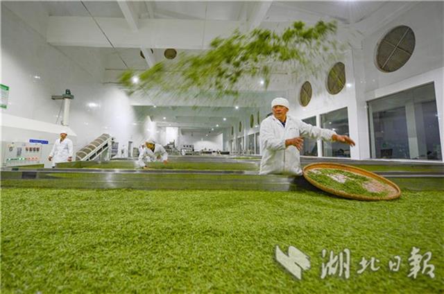 4月2日,在秭歸縣九畹絲綿茶自動化生產(chǎn)車間,制茶師對鮮葉進(jìn)行攤晾。
