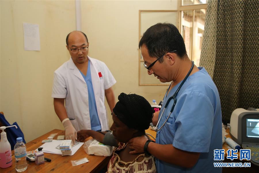 4月4日,在盧旺達首都基加利,中國醫(yī)療隊醫(yī)生賈文(右)和于鵬勇(左)為一名當(dāng)?shù)夭∪诉M行檢查。 新華社記者呂天然攝