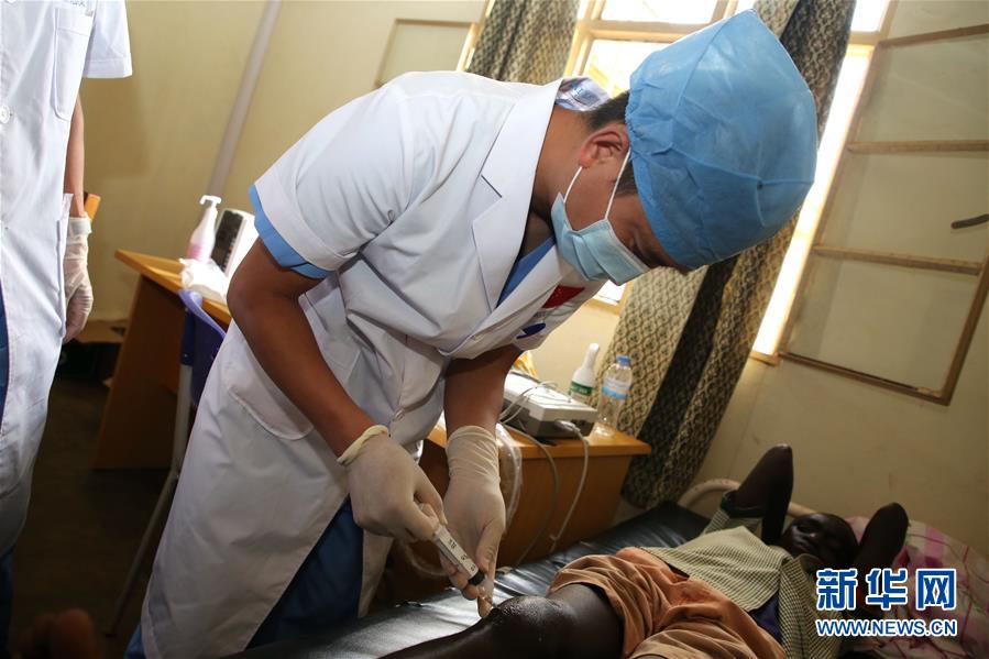 4月4日,在盧旺達首都基加利,來自中國的骨科醫(yī)生趙尚軍為一名當(dāng)?shù)啬泻⒅委煛? 新華社記者呂天然攝