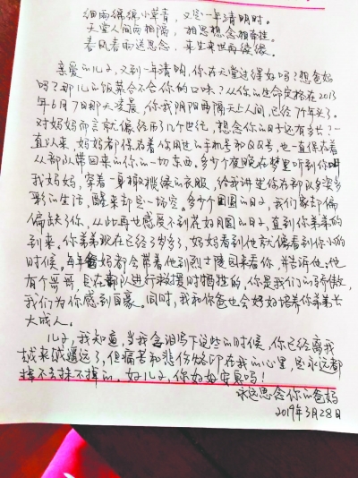 長(zhǎng)江日?qǐng)?bào)訊(記者尹勤兵)“親愛的兒子,又到一年清明,你在天堂過得還好嗎?想爸媽嗎?那兒的飯菜合不合你的口味?”2019年清明節(jié)前夕,一位媽媽給犧牲了近6年的兒子寫了一封永遠(yuǎn)都無法寄出的家信,這是她寫的第六封這樣的家書。