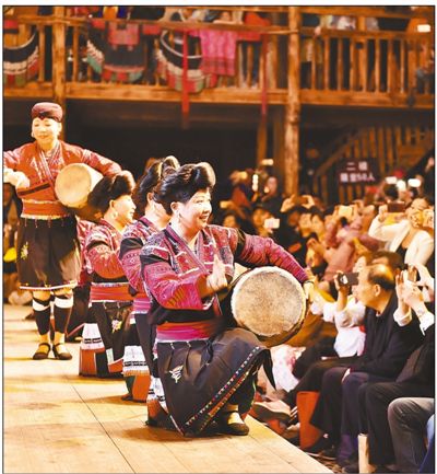 4月7日,廣西龍勝各族自治縣黃洛瑤寨的瑤族群眾為游客表演歌舞。