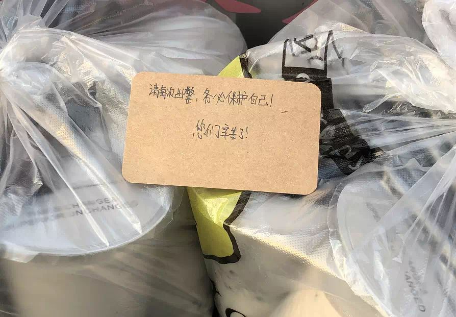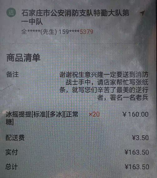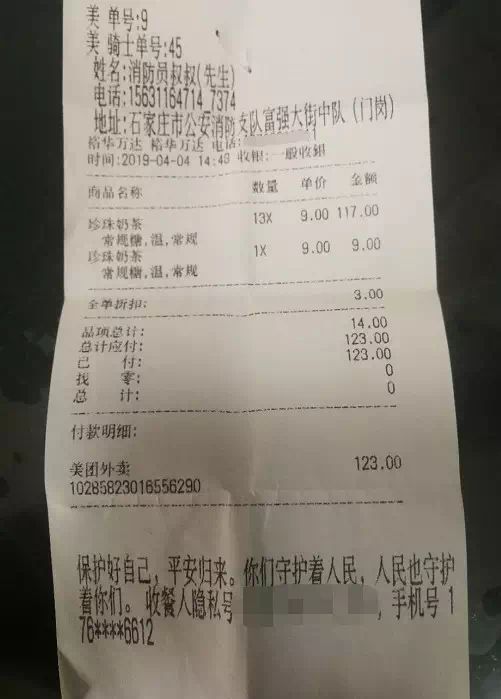 同一天,石家莊消防支隊富強大街中隊也收到了14杯奶茶,外賣單子上寫著“保護好自己,平安歸來。你們守護著人民,人民也守護著你們!”