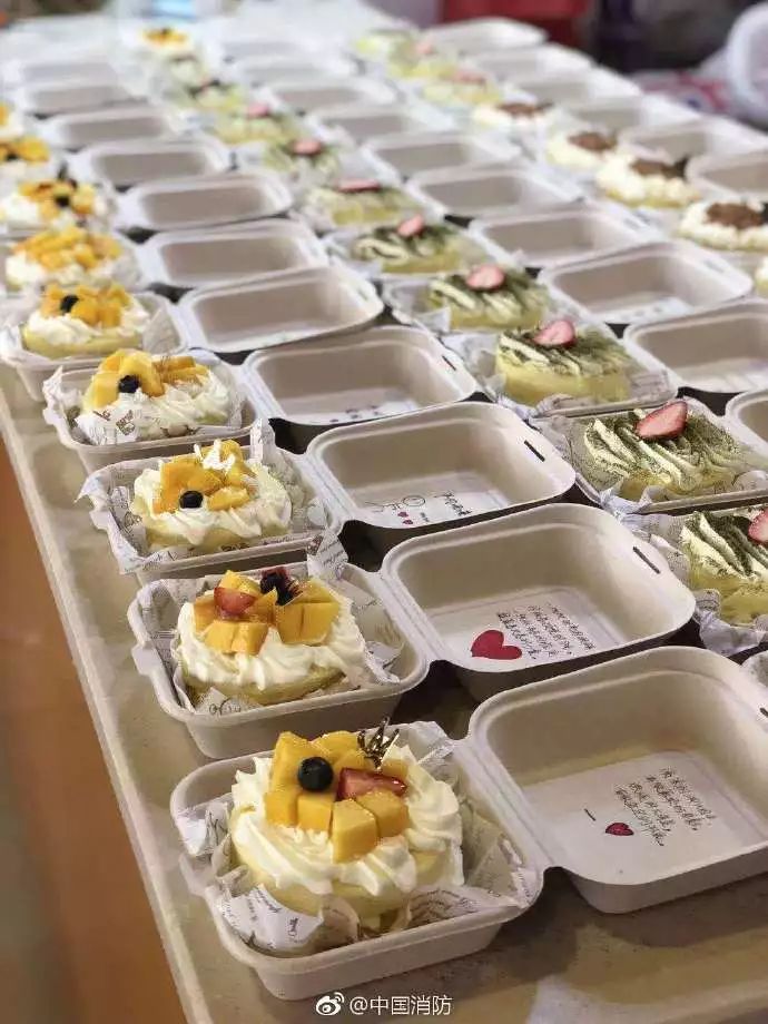 幾十塊蛋糕,每塊蛋糕的盒子上都畫著用心的手繪:有正在救火的消防隊員,有各式各樣可愛的卡通圖案……而每一幅手繪旁邊,寫滿了暖心的話語,“不懼危險”“平安歸來”“夜空中最閃亮的星”……