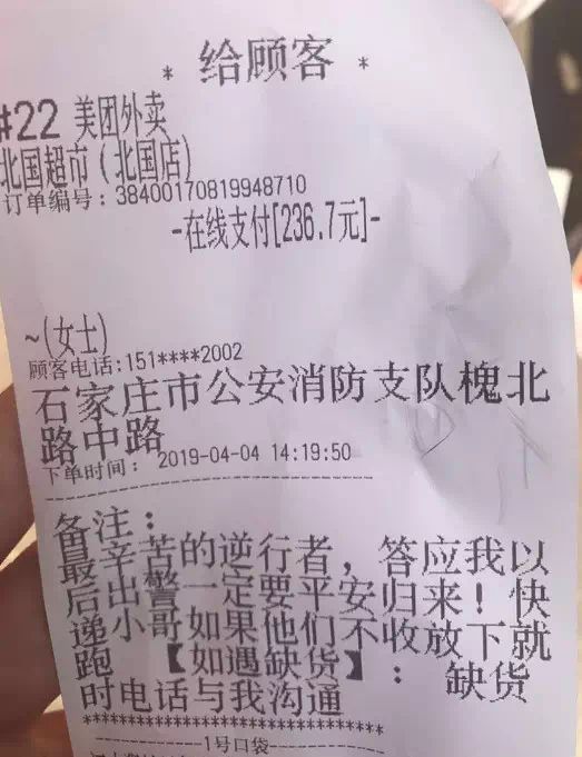 最近,河北石家莊的消防隊員們也收到了很多暖心外賣。每一單外賣背后,都是一個暖心的問候。