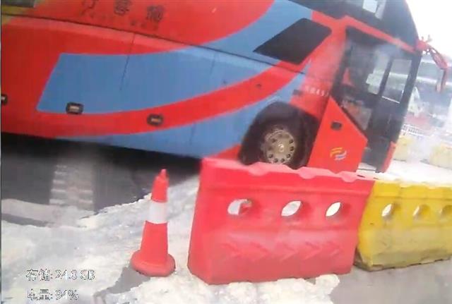 在車內取出滅火器后,李勛對著冒火的車輪輪轂進行噴灑,不顧大風把干粉吹到自己臉上鼻子里。一旁的同事周銳在引導疏散司乘人員轉移至安全區域,并協助滅火,同時立即召集現場收費站工作人員協助清空收費站的其他車輛和人員,設置警戒區域,并將大客車后方來車截停。