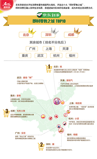 “415”四周年慶前夕,京東到家綜合評估消費體量和增速兩大指標,評選出十大“即時零售之城”,TOP3依次是:北京、深圳、成都,其余登榜的有廣州、上海、天津、重慶、武漢、杭州和福州。這些喜提“即時零售之城”的城市,依托互聯網平臺賦能和即時配送網絡的完善,即時消費已融入各種生活場景,滲透進城市肌體的毛細血管,成為本地主流消費方式,全方位提升市民生活品質。