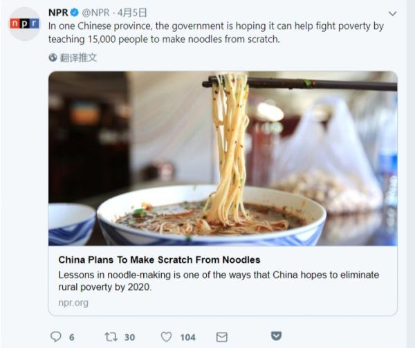 據美國全國公共廣播電臺網站(NPR)4月4日報道,“授人以魚不如授人以漁”這句諺語在中國有了新的解讀:給一個人一碗面,你可以讓他吃飽一天;教一個人如何做面條,你可以讓他一輩子都吃飽。