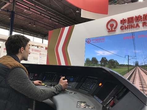 4月10日,在波黑莫斯塔爾市舉行的博覽會上,觀眾在中國鐵路總公司展臺體驗高鐵操作。