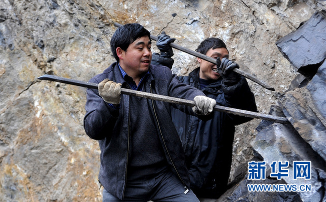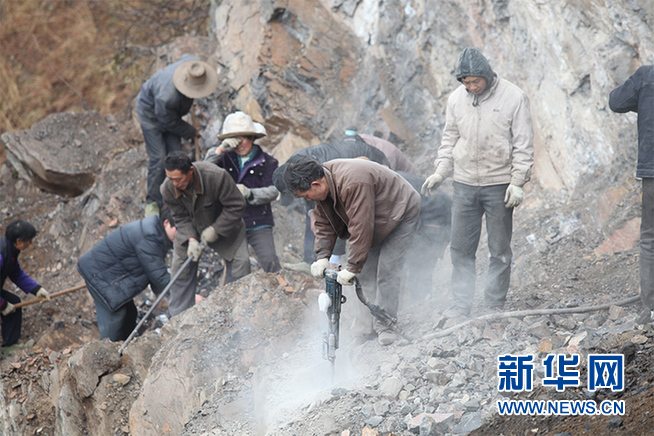 資料圖:王光國(左一)帶領店子坪村村民一鋤一鋤,一釬一釬地砸向絕壁頑石。