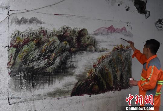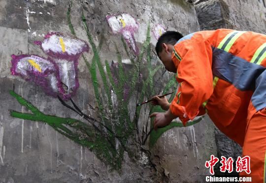 圖為重慶一名環衛工人在鏟掉“牛皮癬”的墻壁上作畫美化環境。周毅攝