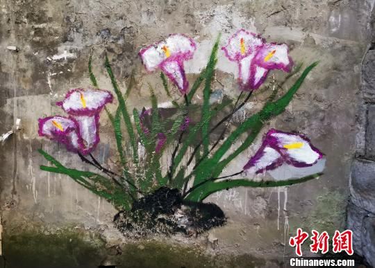 圖為環衛工人利用鏟掉“牛皮癬”的墻壁作畫,吸引市民駐足。周毅 攝