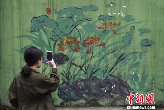 圖為“牛皮癬”墻壁上的畫作吸引市民拍照留念。周毅 攝
