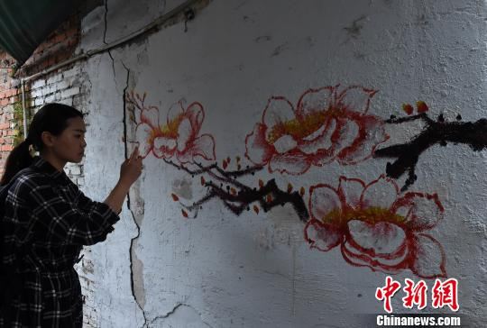 圖為環衛工人在鏟掉“牛皮癬”的墻壁上作畫美化環境。周毅 攝