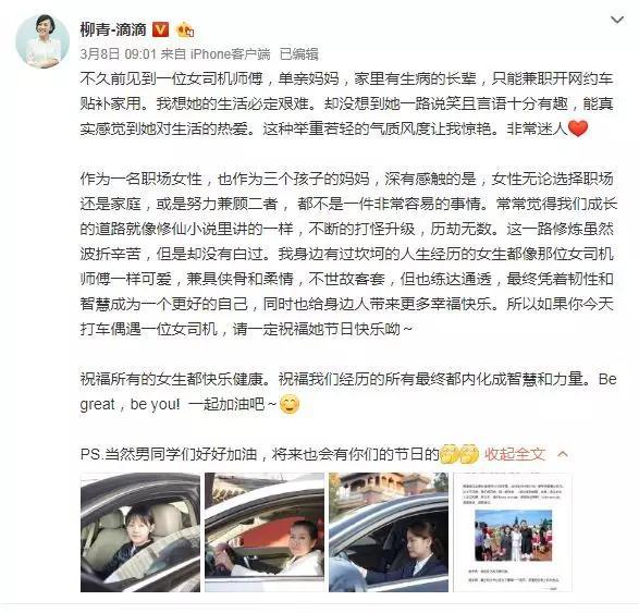 更早時(shí)候,則是3月8日婦女節(jié),她當(dāng)時(shí)說:“作為一名職場女性,也作為三個(gè)孩子的媽媽,深有感觸的是,女性無論選擇職場還是家庭,或是努力兼顧二者,都不是一件非常容易的事情。常常覺得我們成長的道路就像修仙小說里講的一樣,不斷的打怪升級,歷劫無數(shù)。這一路修煉雖然波折辛苦,但是卻沒有白過。我身邊有過坎坷的人生經(jīng)歷的女生都像那位女司機(jī)師傅一樣可愛,兼具俠骨和柔情,不世故客套,但也練達(dá)通透,最終憑著韌性和智慧成為一個(gè)更好的自己,同時(shí)也給身邊人帶來更多幸福快樂。”