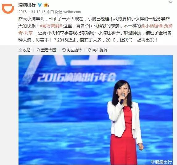 2016年,在滴滴的年會上,柳青一襲裙裝低調(diào)回歸,并發(fā)表演講:我們已無路可退,唯有打倒對手,贏得戰(zhàn)爭!