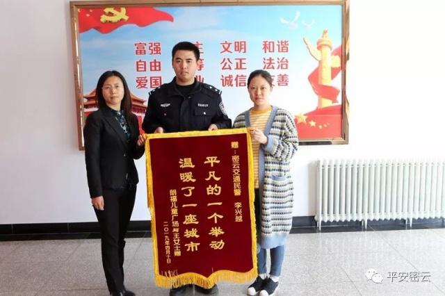 見到李警官后王女士非常開心,握著他的手連聲道謝,并送上一面錦旗。而李警官只靦腆地笑著,直說這是微不足道的小事,是善意的自然迸發,壓根沒放在心上。記者通過密云公安分局聯系到李興越,他承認是有這么回事。“女同志在懷孕后期彎腰是很困難的,舉手之勞,我們每名警察遇到這樣的情況都會伸出援助之手的。”