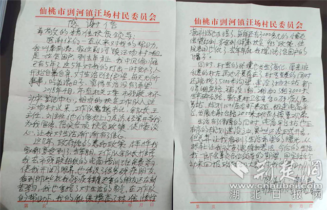 荊楚扶貧網(wǎng)(通訊員 胡慧敏 陳芬)“感謝你們一直以來對(duì)我的幫助,這幾年政府給的惠民政策,我樣樣都享受到了,也讓我看到了希望的曙光……”4月15日,家住剅河鎮(zhèn)汪場(chǎng)村三組的秦前濤將自己手寫的《感謝信》送到駐村工作隊(duì),雖因中風(fēng)后遺癥走路仍顫顫巍巍,秦前濤的精神面貌卻一改往常,容光煥發(fā)。