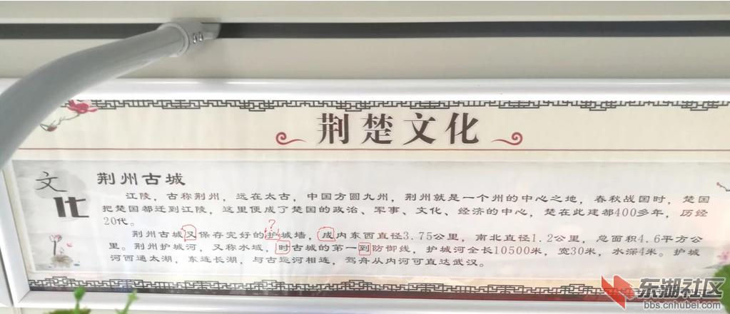 3月10日,網(wǎng)友在《民生熱線》上發(fā)帖稱(chēng):從荊州火車(chē)站乘24路公交車(chē)時(shí),看到車(chē)廂窗上有幾塊介紹荊楚文化的銘牌。這塊宣傳優(yōu)秀荊楚文化的銘牌上,180個(gè)字中有四個(gè)錯(cuò)別字,此外介紹文字中還有文理文辭不精準(zhǔn)、不通順的語(yǔ)詞,譬如將荊州有保存完好的“城墻”寫(xiě)成荊州有保存完好的“護(hù)城墻”之類(lèi)。