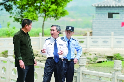 4月15日,在青云村新修的石護欄邊,扶貧干部杜凡(中)、付旭東(右)正在和村主任熊兵商討下一步治理計劃