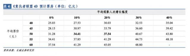 另據長城證券研報預估,《復聯4》票房預測在 25 億至 48 億之間。“當觀影人次增長幅度分別為 0%、10%、20%、30%、40%,平均票價分別為 40、45、50、55、60 元時,可得到一系列《復仇者聯盟 4》預計票房。因為票價與觀影人次成反比關系,我們剔除最高票價與最高觀影人次得到的最樂觀情況組合,得到預測票房區間。 考慮中性假設情形,即在《復仇者聯盟 3》平均觀影人次為 6257 萬的條件下且觀影人次增長幅度為10-20%,全國平均票價為50元時,《復仇者聯盟 4》的預計票房為35億左右。 ”