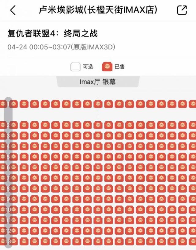 同時,21世紀經濟報道記者以燈塔研究院影院吸引力指數排名前20位的影院作為樣本,在淘票票APP上搜索《復聯4》上座率,結果各異。在零點場中,北京耀萊成龍國際影城(五棵松店),在23:59-0:15,13個廳放映《復聯4》,一個VIP廳滿座,上座率均很高;北京首都電影院(西單店),0:00-0:20場次,3個廳,一個廳滿座,上座率均很高;北京金泉港IMAX國際影城,0:05-0:10,19個廳,五個廳滿座,其中三個VIP廳,上座率均很高;北京金逸國際影城(朝陽大悅城店),0:00-0:25,8個廳,三個廳滿座,其中兩個VIP廳,上座率均很高;北京寰映影城(合生匯店),0:10-0:20,五個廳,上座率均很高;上海中影國際影城(合生匯店),0:15-0:30,三個廳,上座率中等,約二分之一,約35人;上海萬達影城(五角場店),0:10-0:30,6個廳,上座率均較高。