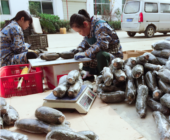 (工人逐一地在為新鮮蓮藕打包發貨)