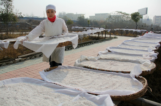 (巴河鎮美味佳食品有限公司工人正在晾曬藕粉)