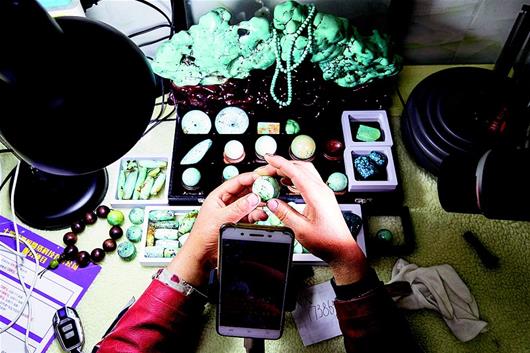 4月16日,竹山縣麻家渡鎮(zhèn)營(yíng)盤河村一家綠松石經(jīng)營(yíng)戶利用手機(jī)直播的方式展示銷售綠松石。目前竹山縣有近5000家綠松石加工經(jīng)營(yíng)戶利用網(wǎng)絡(luò)銷售綠松石產(chǎn)品。近年來(lái),該縣以麻家渡鎮(zhèn)和秦古鎮(zhèn)為主,輻射全縣5個(gè)鄉(xiāng)鎮(zhèn)的綠松石產(chǎn)業(yè)集群,初步形成開采、研發(fā)、加工、檢測(cè)、營(yíng)銷各環(huán)節(jié)比較完整、體系相對(duì)健全的產(chǎn)業(yè)鏈條。截至2018年底,全縣各類綠松石經(jīng)營(yíng)商戶達(dá)到5600家,年均銷售收入約10億元,帶動(dòng)約5萬(wàn)人就業(yè)。