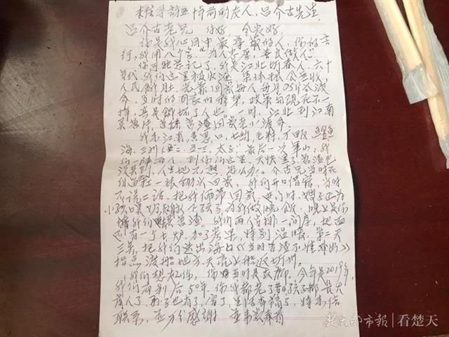 今年1月29日,呂廣灣村民呂紹許前往軍山村委會辦事,無意中看辦公室的桌上有一封信,收信人為“呂介古”,信封上把黃顙口鎮寫成“黃思口”。呂紹許有些納悶,他們村沒有叫“呂介古”的人,自己的父親叫呂鑒古,難道是寄信人寫錯了父親的名字?在村委會干部的見證下,呂紹許拆開了這封疑似自己父親的信,在信紙首頁的頂端,卻寫著“來信尋訪五十年前友人呂介古先生”,原來這是一封尋友的感恩信。