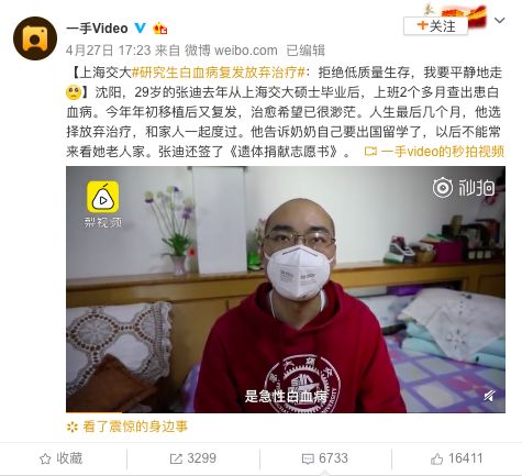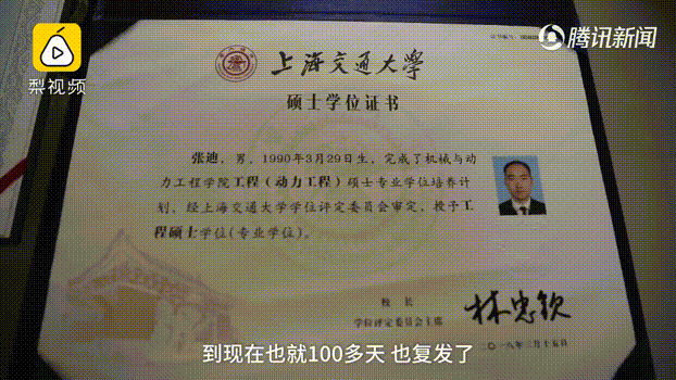 據梨視頻,張迪去年從上海交大碩士畢業后,上班兩三個月查出患白血病。