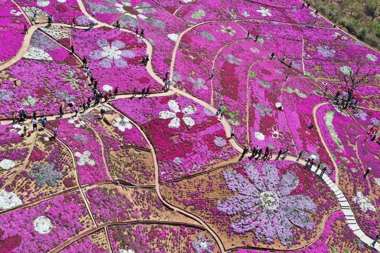5月2日,游人在河北省唐山市遷西縣雨花谷景區(qū)賞花游覽(無人機拍攝)。新華社發(fā)(王愛軍 攝)