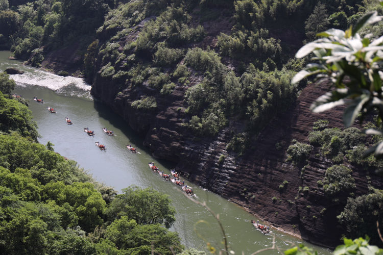 5月1日,游人乘竹筏在福建武夷山九曲溪游覽。新華社發(fā)(陳穎 攝)